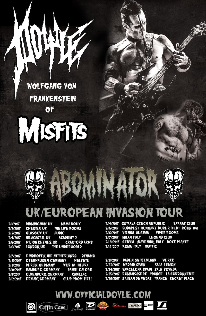 The band features vocalist Alex “Wolfman” Story (Cancerslug), bassist Brandon Strate, and drummer Brandon Pertzborn. They will be playing songs from their debut LP ABOMINATOR, (released in 2013 on Doyle’s own MONSTERMAN RECORDS) as well as favorites from the MISFITS catalog.