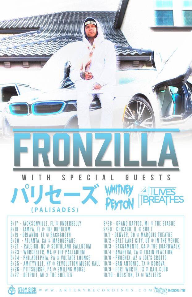 Fronzilla has been delivering ferociously energetic sets with Attila out on Vans Warped Tour this summer. Get ready for Fronzilla’s headlining tour with Palisades, Whitney Peyton and It Lives It Breathes. VIP On Sale: Thursday, August 6th at 1pm EST. General On Sale: Monday, August 10th at 10am local