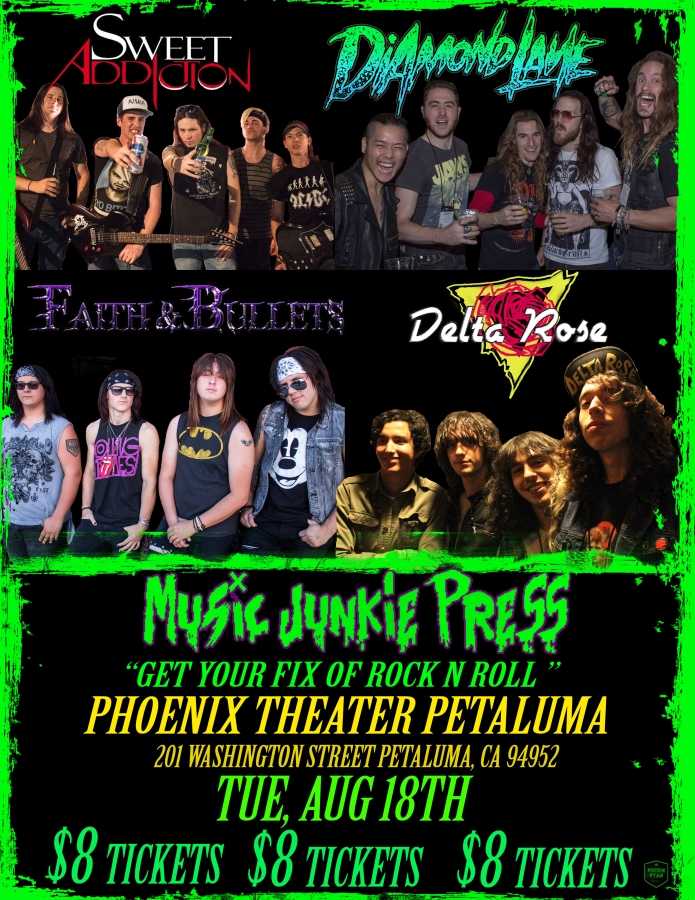 “Sweet Addiction is ready to rock on August 18th when we share the bill with Diamond Lane, Delta Rose, and Faith & Bullets – It’s been far too long since the Bay has seen a “REAL” Rock show of this caliber and we are ready and excited to blow the roof off the Phoenix Theater in Petaluma – sorry Tom – Thank you to our friends at Music Junkie Press for putting together one hell of a line-up and stay tuned for new releases as we will be heading into the studio to record a week from now! SEE YOU ON THE 18TH BAY AREA!!!! – S.A.”