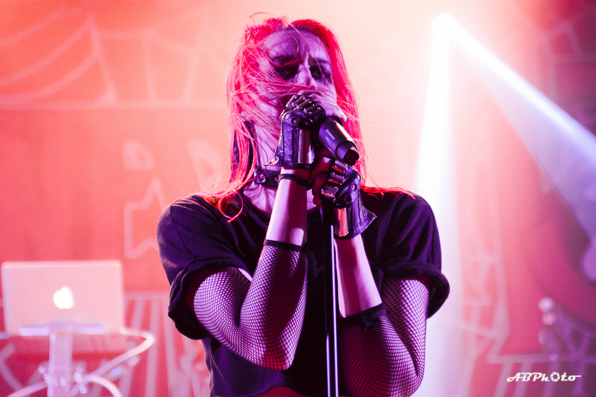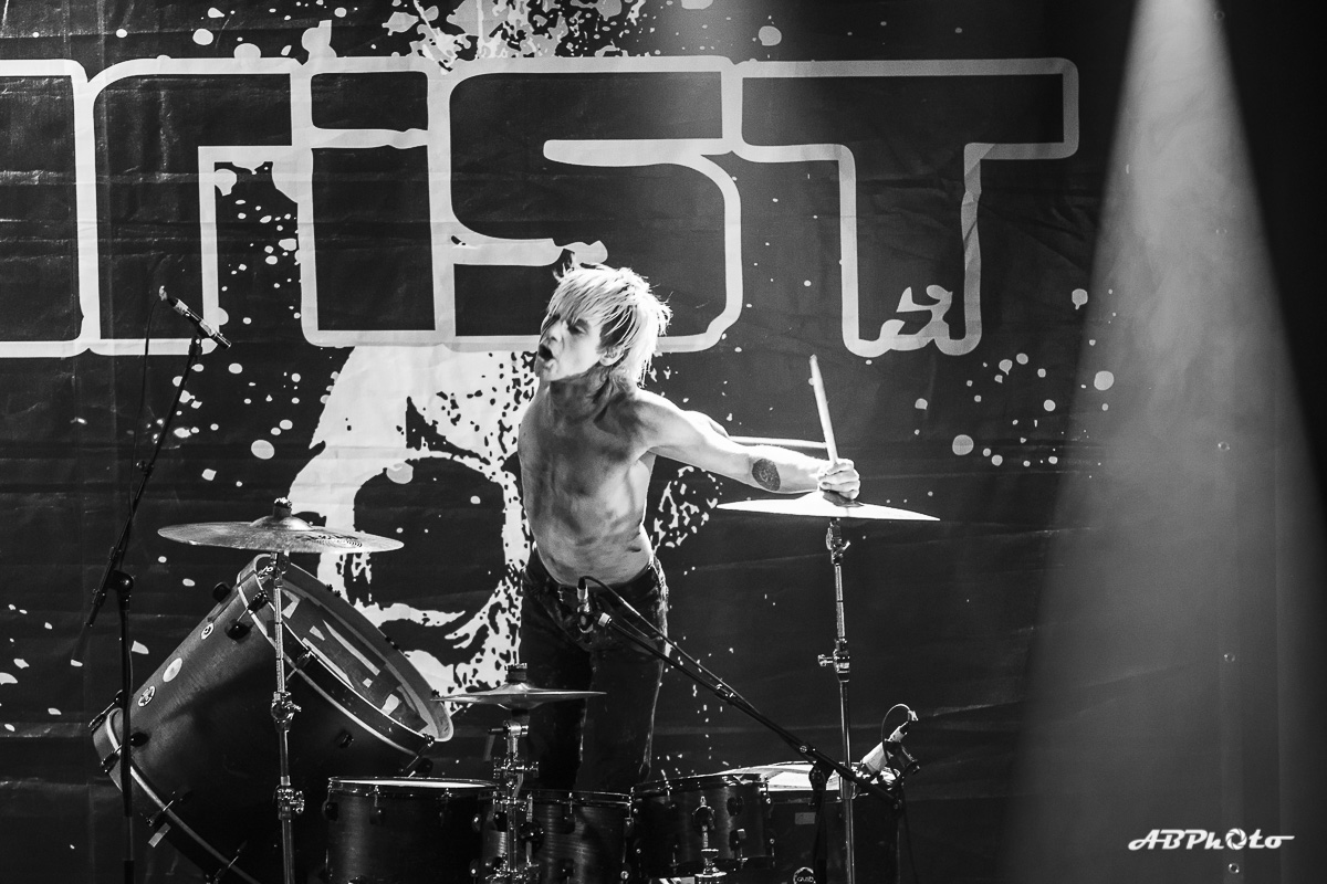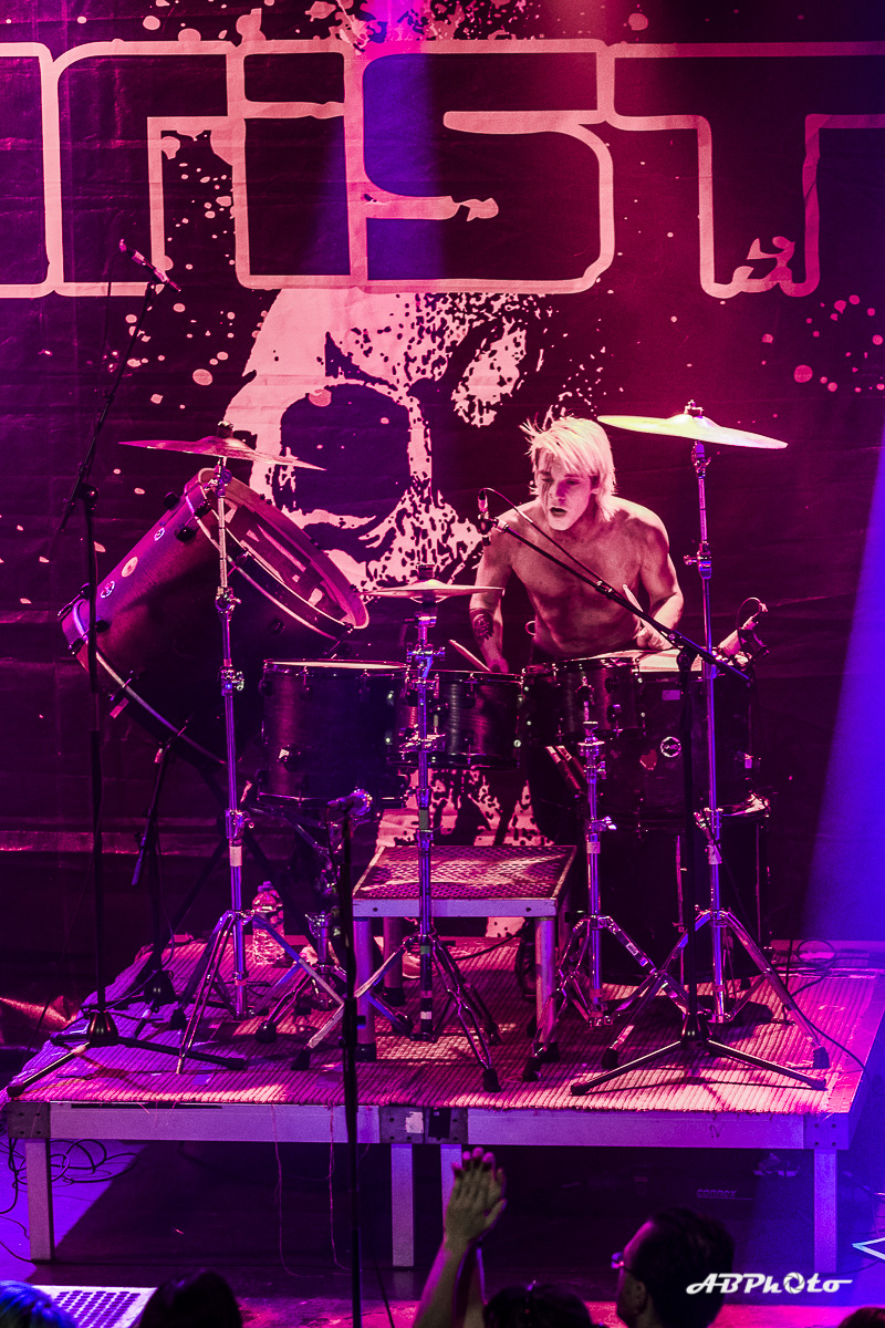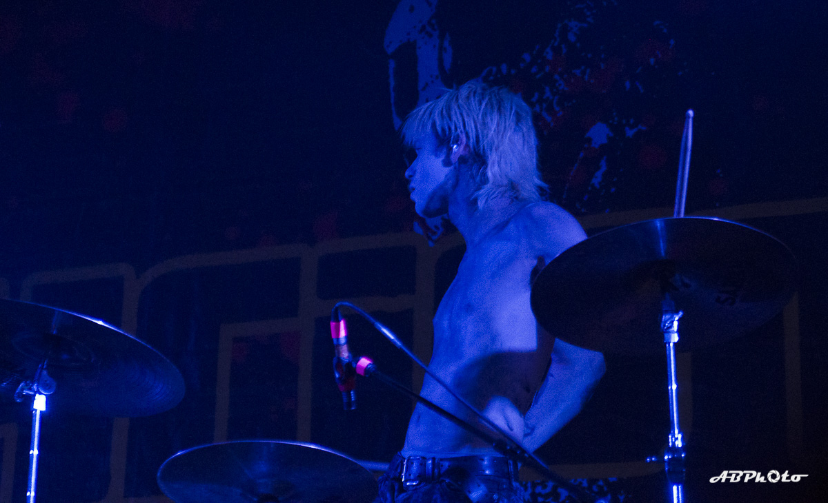 Finally, Combichrist hit the stage at around 10 pm. At the moment we experience really hot summer days, but believe me, the temperature inside rose from hot to sauna in no time. If you’ve seen this band live before, you probably know that they never disappoint with their performance. You just can’t escape the steady two drums beat of Joe Letz (‘the female drummer with the colorful make-up’ as one German print press wrote) and Nick Rossi. Add the rock component with Eric Michael on guitar, some keyboard (Elliott Berlin) and synth parts and on top a charismatic frontman like Andy LaPlegua. Over the last years Rock elements were added to their Electro/Techno sound. A change that wasn’t welcome with every fan of the earlier years. The addition of Rock elements in my opinion opened their music to a wider audience. I’ve seen them a few times live now and every time it was a party, with people jumping, dancing and singing. Not exception this time.