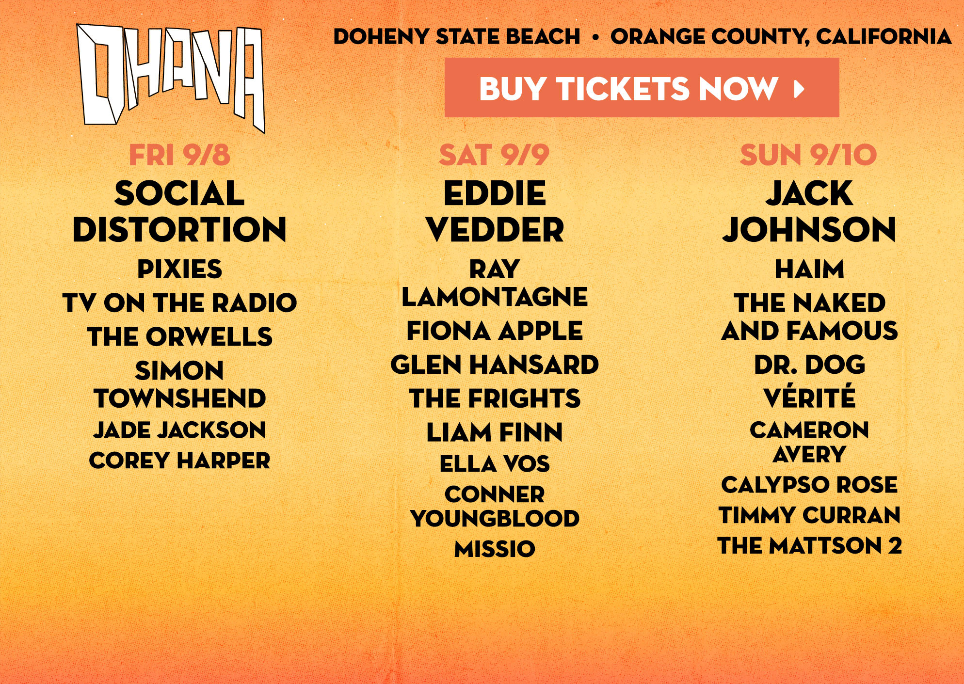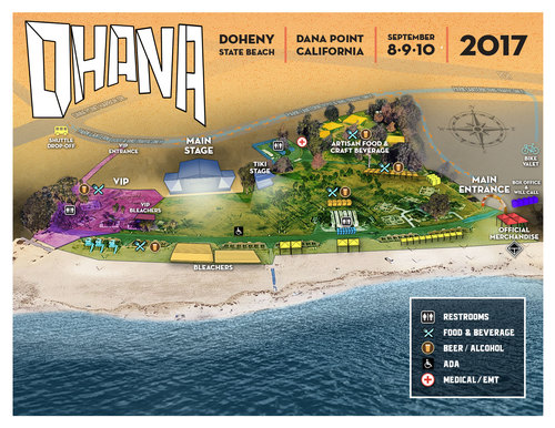 Get Ready for the Three Day Music Festival at Doheny State Beach in Dana Point, California. The festival is being held on September 8-10 and will have a diverse music lineup. Ohana will donate a portion of proceeds to the San Onofre Parks Foundation and the Doheny State Beach Interpretive Association. Festival general admission allows roaming throughout the lush grass areas of Doheny State Beach, right off the shore of the Pacific Ocean, touching the sand.