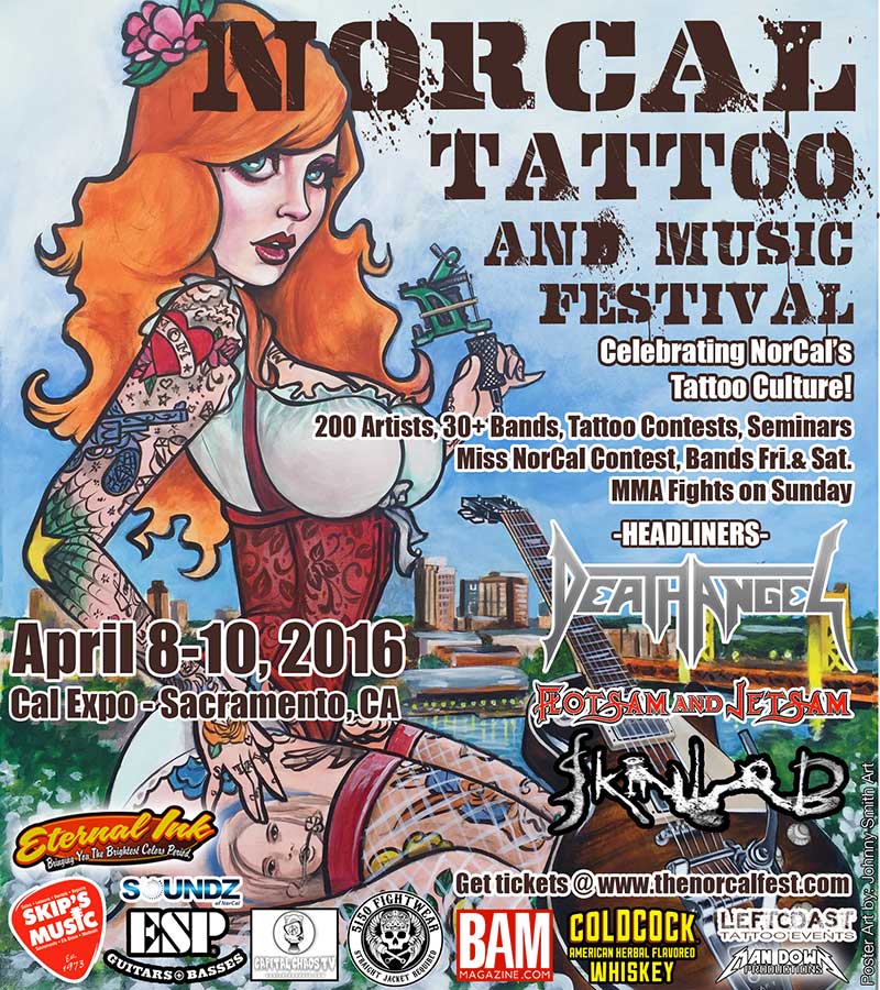Left Coast Tattoo Events is proud to present the 1st annual NorCal Tattoo & Music Festival! Sponsored by COLDCOCK American Herbal Flavored Whiskey, Eternal Ink, Man Down Productions, Skip’s Music, BAM magazine, ESP Guitars and 5150 Fightwear among others! 3 days of tattooing, art, MMA and hard rockin’ music from 40+ bands. Headlines are Death Angel, Flotsam & Jetsam and local legends Skinlab!