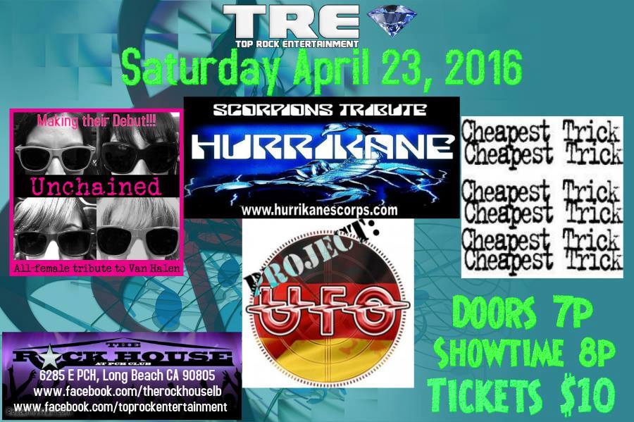 Hey everyone! Lately my attention has been focused on something that finally warrants an announcement: I have a new band. It’s a Van Halen tribute band. It’s all-female. It’s called Unchained. I’d like to introduce you to the girls: that’s me in that skirt (duh), Shannon Moore on vocals, Janna Brunner on drums, and Liza Sanchez on bass. Our debut SoCal show is this coming Saturday, April 23rd at The Rock House in Long Beach, CA. We are sharing the bill with several other wonderful tribute bands and will be going on at about 9:15. We will also be playing at the Blessing of the Bikes event at Cook’s Corner in Trabuco Canyon, CA on May 1st – we go on at 3 pm for a fun-in-the-sun Sunday of live music and bikes. Hope to see you there, and stay tuned for more dates soooon!