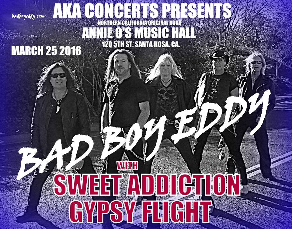 They have an upcoming show on March 25th right here in Santa Rosa, Ca at Annie O’s. It will be a night of unbelievable rock with Bad Boy Eddy, Sweet Addiction, and Gypsy Flight. It is a Friday night, so come out and party with us!