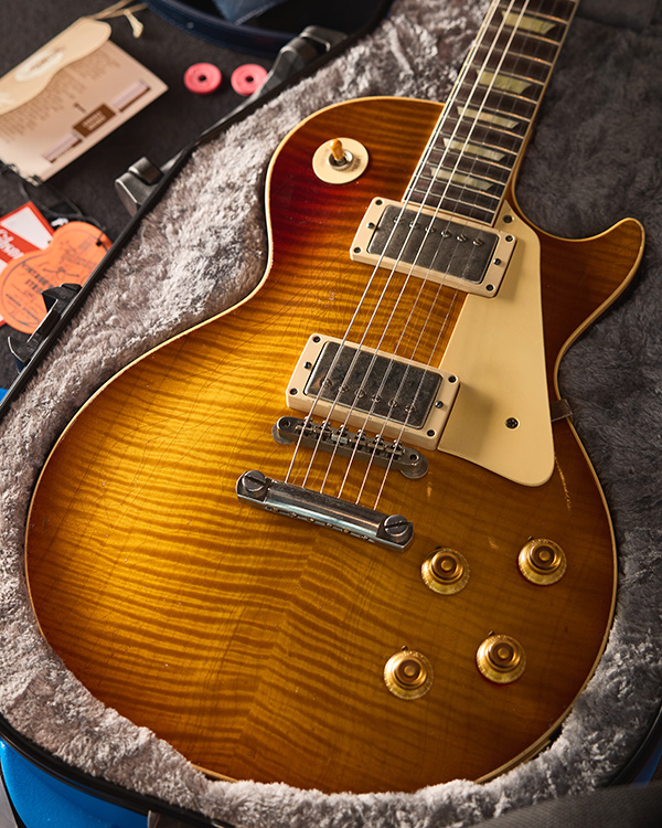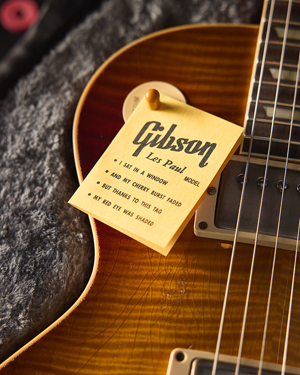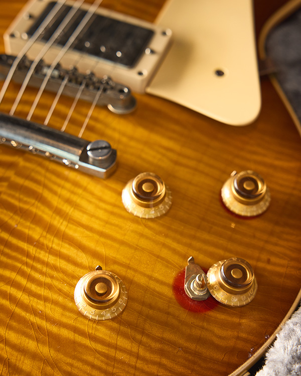 | Like many ’59 Les Pauls, “Red Eye” has a unique and illustrious history. Much of the red color on the top faded while displayed in a store window, except for a patch below the toggle switch that was covered by a hangtag. Ed King of Lynyrd Skynyrd purchased it in 1982 and nicknamed it “Red Eye” after its distinctive appearance. |