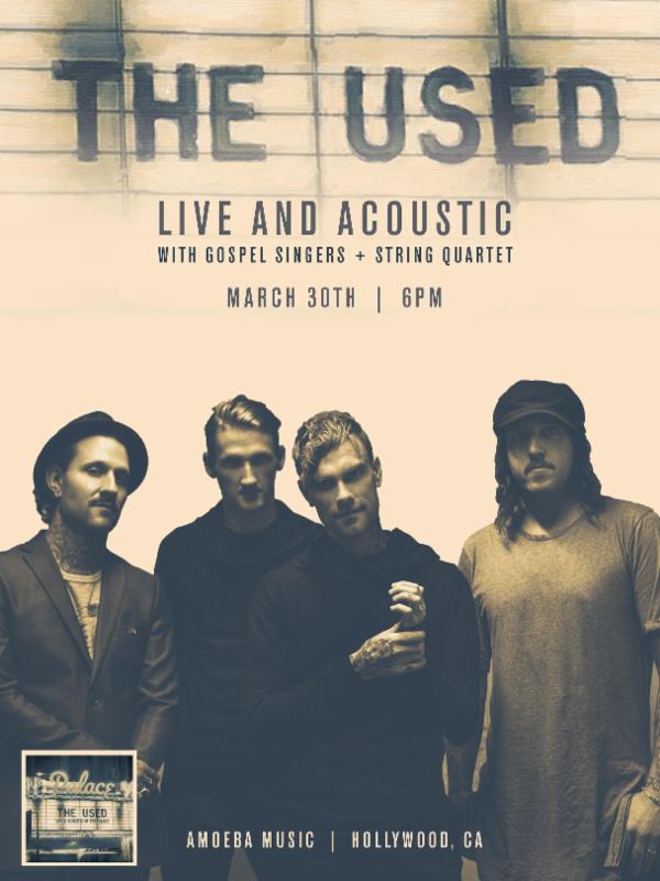 The Used are set to release their new album, Live and Acoustic at The Palace on April 1st. In celebration of the release, they have announced a very special acoustic performance at Amoeba Music in Hollywood, CA on March 30th. The show will kick off at 6 pm and the band will be joined with gospel singers and a string quartet. Though Live and Acoustic at The Palace‘s worldwide release launches on April 1st, 500 lucky fans will be able to purchase the record prior to doors. The record will additionally provide guarantee admission and include a limited-edition “The Used – Live at Amoeba” poster. For more details, please visit: http://bit.ly/22hWm7i.