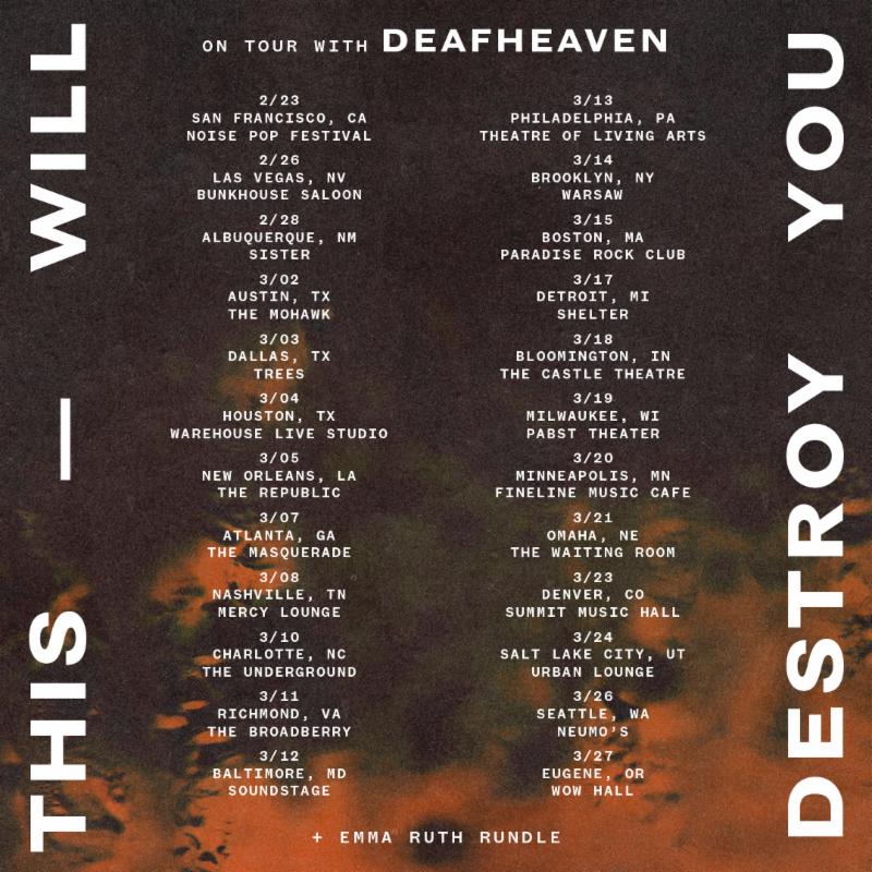 Texas instrumental rock band, This Will Destroy You have announced dates for a Spring Tour supporting Deafhaven. The tour will kick off in San Francisco at the Independent for the Noise Pop Festival and wrap up on March 27th in Eugene, Oregon.